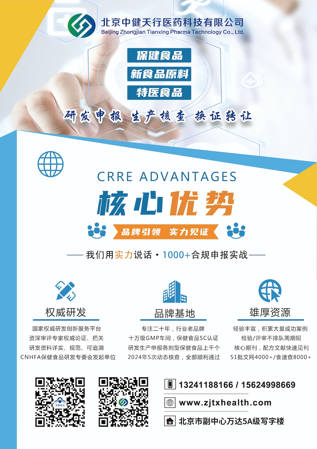 北京中健天行醫(yī)藥科技有限公司(ZJTX PHARMA)成立于2013年,深耕保健食品、“三新”食品、特醫(yī)食品研發(fā)申報(bào)十余載,先后獲國家高新技術(shù)企業(yè)、北京市科技型中小企業(yè)、ISO9001體系認(rèn)證、北京市質(zhì)量管理先進(jìn)集體等資質(zhì)榮譽(yù)。我們始終以"注冊備案精準(zhǔn)化、功能評價(jià)科學(xué)化、合規(guī)體系標(biāo)準(zhǔn)化"為核心競爭力,在保健食品及新食品原料合規(guī)領(lǐng)域成果豐碩,累計(jì)助力超1000家企業(yè)的產(chǎn)品合規(guī)上市,新法規(guī)實(shí)施以來已成功申報(bào)100余項(xiàng)保健食品新產(chǎn)品,完成20多個(gè)產(chǎn)品的動(dòng)態(tài)核查,申報(bào)及核查數(shù)量均居全國前列,同時(shí)雙無換證率先獲國家總局受理,新功能研發(fā)完成3項(xiàng)臨床研究,并助力磷蝦油、牛大力粉、紅花苗、麥角硫因等數(shù)十種新食品原料推進(jìn)合規(guī)進(jìn)程,以實(shí)戰(zhàn)經(jīng)驗(yàn)鋪就高效合規(guī)的申報(bào)通路。我們可為企業(yè)提供涵蓋產(chǎn)品立項(xiàng)、研發(fā)生產(chǎn)、注冊檢驗(yàn)、臨床評價(jià)、合規(guī)申報(bào)、動(dòng)態(tài)核查及成果轉(zhuǎn)化的全鏈條一站式解決方案,誠邀廣大企業(yè)攜手同行,共拓合規(guī)發(fā)展新藍(lán)海!
