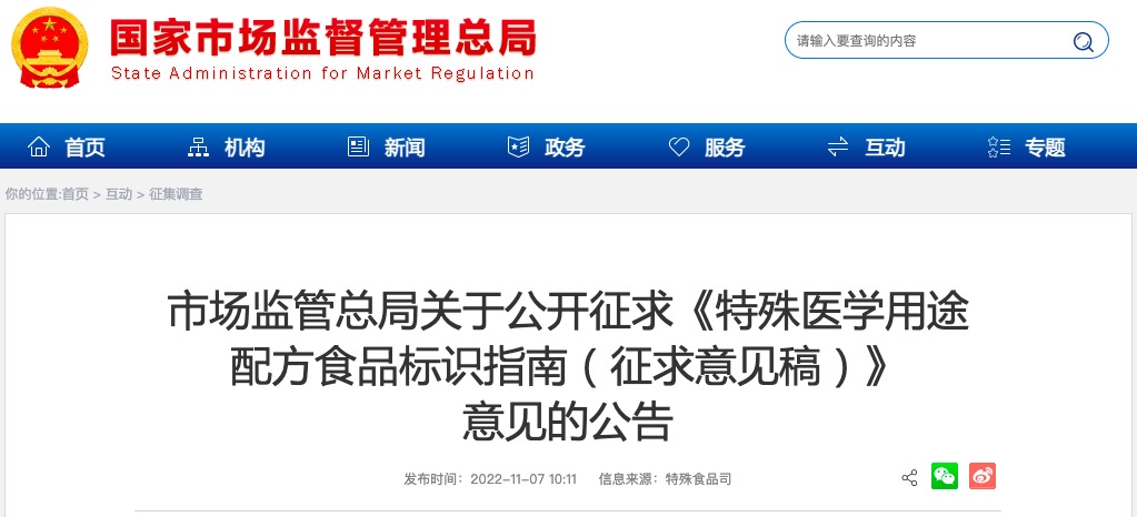 2022年11月7日,國(guó)家市場(chǎng)監(jiān)督管理總局發(fā)布《特殊醫(yī)學(xué)用途配方食品標(biāo)識(shí)指南(征求意見稿)》(下文簡(jiǎn)稱“指南”),征求意見截止日期為2022年11月25日。此次指南公布了特醫(yī)食品小藍(lán)花標(biāo)志樣式,規(guī)定特醫(yī)食品最小銷售包裝應(yīng)標(biāo)注特醫(yī)食品專屬標(biāo)志。