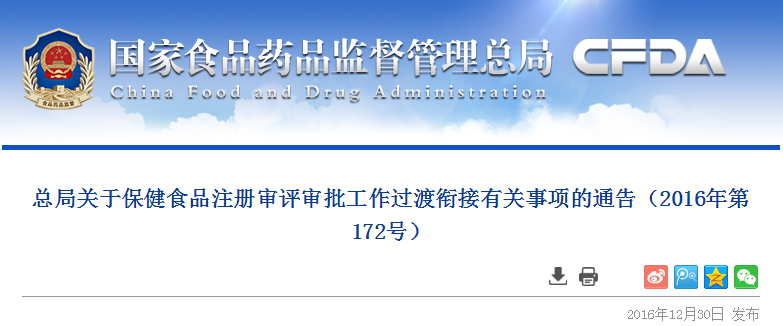 2016年11月15日,國家食品藥品監(jiān)督管理總局印發(fā)了《保健食品注冊(cè)審評(píng)審批工作細(xì)則(2016版)》(以下簡(jiǎn)稱《細(xì)則》),明確了保健食品注冊(cè)審評(píng)審批的工作程序和要求。為保證保健食品注冊(cè)審評(píng)審批工作平穩(wěn)有序開展,現(xiàn)就《細(xì)則》實(shí)施前已受理注冊(cè)申請(qǐng)的審評(píng)審批事項(xiàng)通告如下: