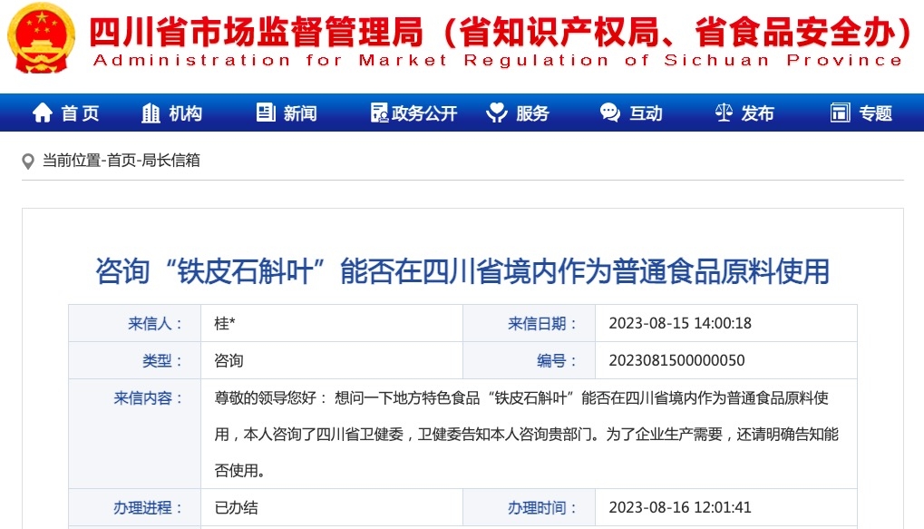 2021年,《四川省開展天麻、鐵皮石斛、靈芝按照傳統(tǒng)既是食品又是中藥材的物質(zhì)管理試點(diǎn)方案》經(jīng)省政府同意,并報(bào)國(guó)家衛(wèi)生健康委、國(guó)家市場(chǎng)監(jiān)管總局核定,決定在四川省內(nèi)開展為期一年的天麻、鐵皮石斛、靈芝三種物質(zhì)按照傳統(tǒng)既是食品又是中藥材的物質(zhì)管理試點(diǎn)工作。產(chǎn)品范圍:在全省行政區(qū)域內(nèi)(包括省外種植基地)種植以天麻、鐵皮石斛、靈芝為原材料,按照傳統(tǒng)生產(chǎn)工藝或飲食習(xí)慣食用加工的普通食品,不包括化學(xué)提取物產(chǎn)品(如含某種物質(zhì)提取素的藥品、保健食品)。試點(diǎn)產(chǎn)品須按“食品生產(chǎn)許可分類目錄”取得相關(guān)品種生產(chǎn)許可后方可從事生產(chǎn)加工。目前試點(diǎn)工作已結(jié)束。經(jīng)查詢,鐵皮石斛葉已終止審查,衛(wèi)生行政部門建議按照《食品安全法》第29條管理。