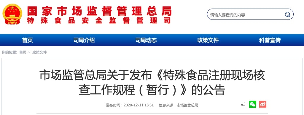 為規(guī)范特殊食品注冊(cè)現(xiàn)場(chǎng)核查工作,依據(jù)《中華人民共和國(guó)食品安全法》《保健食品注冊(cè)與備案管理辦法》《嬰幼兒配方乳粉產(chǎn)品配方注冊(cè)管理辦法》《特殊醫(yī)學(xué)用途配方食品注冊(cè)管理辦法》等法律規(guī)章,市場(chǎng)監(jiān)管總局制定了《特殊食品注冊(cè)現(xiàn)場(chǎng)核查工作規(guī)程(暫行)》,現(xiàn)予發(fā)布,自公布之日起施行。