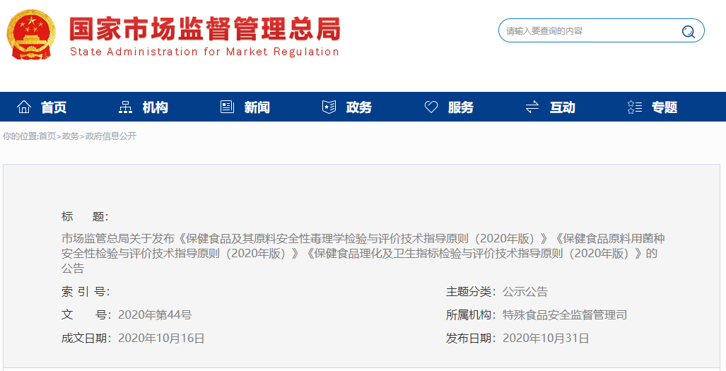 根據(jù)《中華人民共和國食品安全法》,經(jīng)與國家衛(wèi)生健康委協(xié)商一致,市場監(jiān)管總局制定了《保健食品及其原料安全性毒理學檢驗與評價技術指導原則(2020年版)》《保健食品原料用菌種安全性檢驗與評價技術指導原則(2020年版)》《保健食品理化及衛(wèi)生指標檢驗與評價技術指導原則(2020年版)》,現(xiàn)予印發(fā),自公告之日起施行。