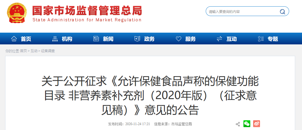 公眾還可以登錄國家市場(chǎng)監(jiān)督管理總局網(wǎng)站(http://www.samr.gov.cn),通過首頁互動(dòng)欄目中的“征集調(diào)查”提出意見建議,或者將意見建議郵寄至:市場(chǎng)監(jiān)管總局特殊食品司,北京市西城區(qū)北露園1號(hào),并在信封上注明“《允許保健食品聲稱的保健功能目錄 非營養(yǎng)素補(bǔ)充劑(2020年版)(征求意見稿)》公開征求意見”字樣。