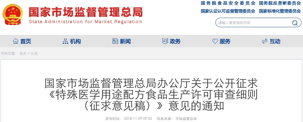 國家市場監(jiān)督管理總局辦公廳關(guān)于公開征求《特殊醫(yī)學(xué)用途配方食品生產(chǎn)許可審查細(xì)則(征求意見稿)》意見的通知
